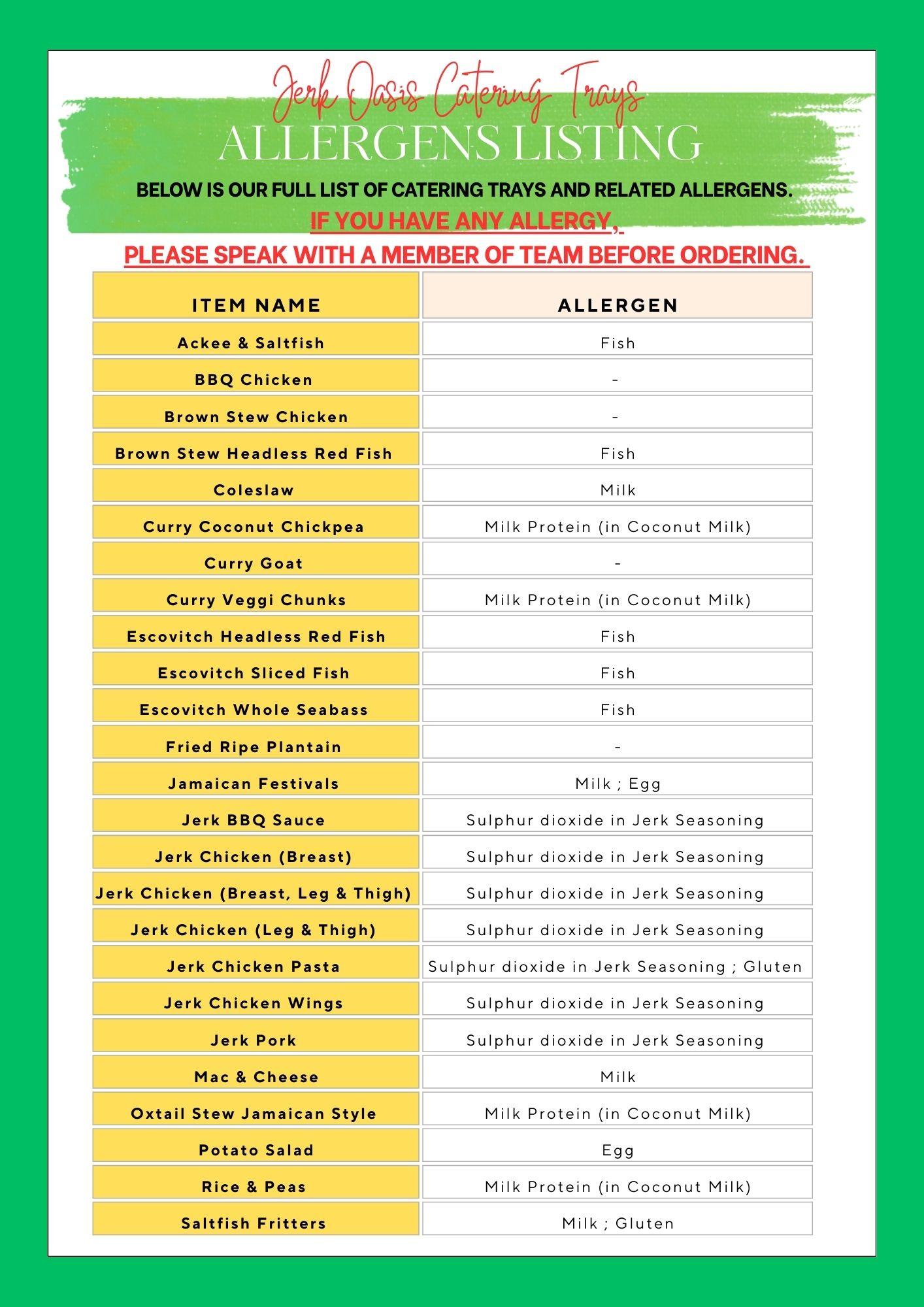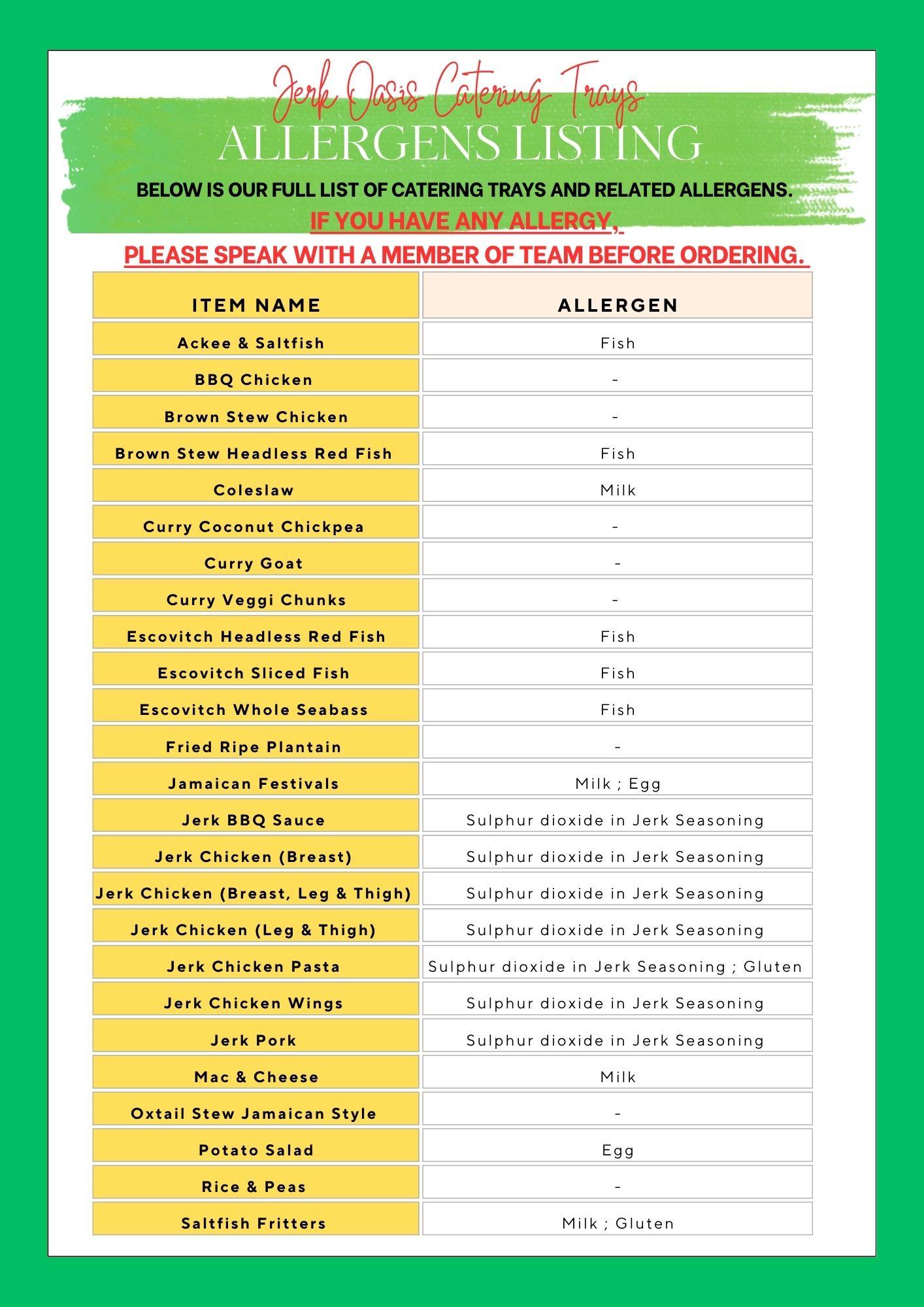 Please note the below allergens listings. If you have an allergy, please speak with a member of the Jerk Oasis team before ordering.