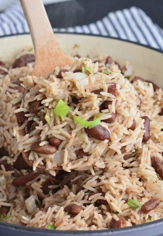 Rice & Peas: Ingredients: White rice, red kidney beans, cinnamon, mixed spices, coconut milk (Allergen), salt, onions, thyme, butter.